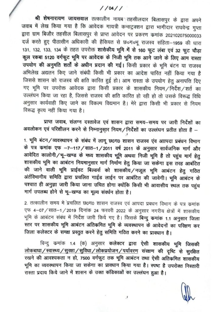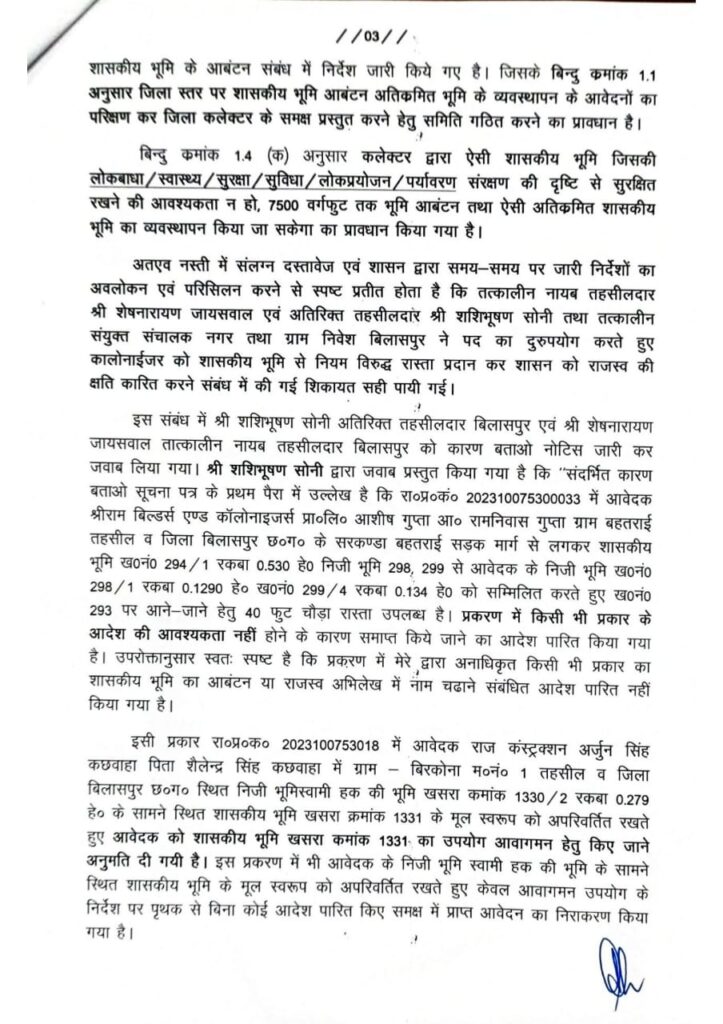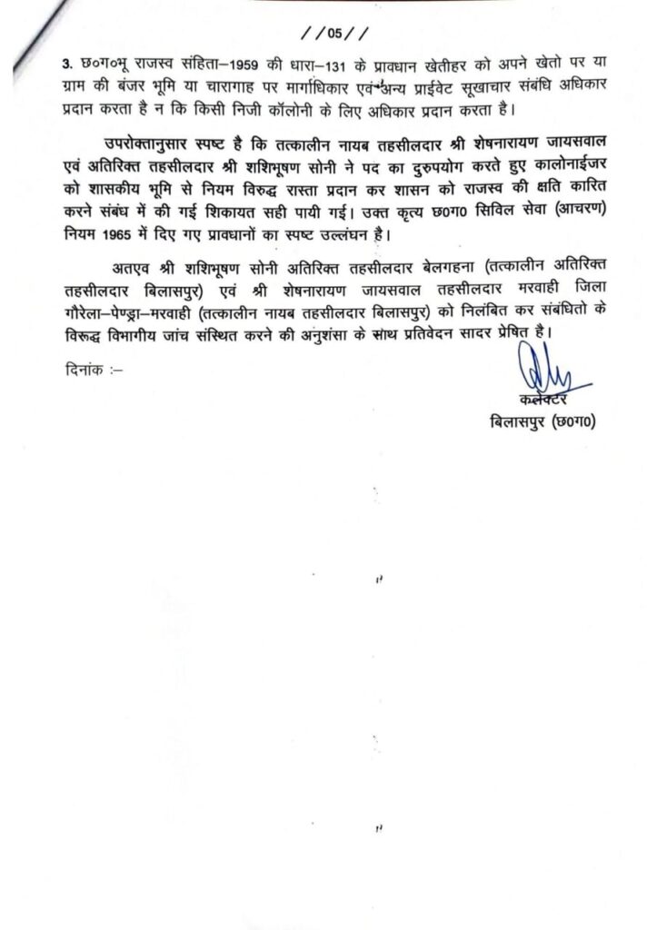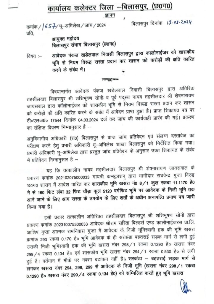 Bilaspur: शासकीय भूमि की बंदरबाट कर बिल्डरों को लाभ पहुंचाने वाले दो तहसीलदारों के खिलाफ जांच करवाने के बाद मामले की पुष्टि होने पर संभाग कमिश्नर को बिलासपुर कलेक्टर ने निलंबन और विभागीय जांच करवाने हेतु प्रतिवेदन भेजा है।