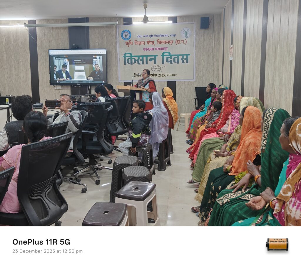 डा. अमित शुक्ला, वैज्ञानिक ने विकसित भारत के अंतर्गत रोजगार एवं आजीविका के लिए वीबी-जी रामजी अधिनियम के बारे में विस्तार से कृषकों को बताया। इंजी. पंकज मिंज, वैज्ञानिक ने प्लास्टिक मल्चिंग की जगह पैरा मल्चिंग व पैरा प्रबंधन के संबंध में कृषकों को जानकारी दी। डा. निवेदिता पाठक, वैज्ञानिक ने कृषकों को प्लास्टिक का उपयोग कम से कम करने की तथा उससे होने वाले दुस्प्रभाव की जानकारी दी।