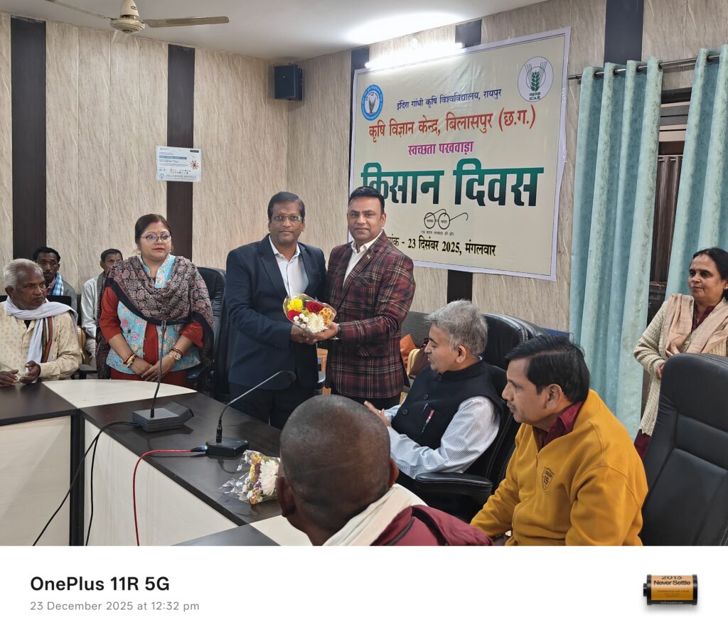 बिलासपुर।कृषि विज्ञान केन्द्र में स्वच्छता पखवाड़ा अंतर्गत किसान दिवस सह एक दिवसीय जागरूकता कार्यक्रम का आयोजन किया गया। डा. शिल्पा कौशिक, प्रभारी वरिष्ठ वैज्ञानिक एवं प्रमुख, कृषि विज्ञान केन्द्र, बिलासपुर ने विकसित भारत के अंतर्गत रोजगार एवं आजीविका के लिए वीबी-जी रामजी अधिनियम तथा किसान दिवस कार्यक्रम की संक्षिप्त रूपरेखा प्रस्तुत की। कार्यक्रम के मुख्य अतिथि डाॅ. आरके. एस. तोमर, प्रभारी अधिष्ठाता, कृषि महाविद्यालय बिलासपुर ने किसान बंधुओं को खेती में स्वच्छता को कैसे जोड़ा जाए इस संबंध में ध्यान आकृष्ट किया तथा कृषकों को पराली नहीं जलाने का अनुरोध किया क्योंकि पराली जलाने से हमारे सूक्ष्म जीव और मित्र कीट खत्म हो जाते हैं। डा. एस.एल. स्वामी, अधिष्ठाता, कृषि महाविद्यालय, लोरमी ने कृषकों को प्राकृतिक व जैविक खेती के सभी मापदंडों को अपनाकर मूल्य संवर्धन करके खेती करने को प्रोत्साहित किया ताकि कृषकों को उनकी उपज का अधिक मूल्य प्राप्त हो सके।