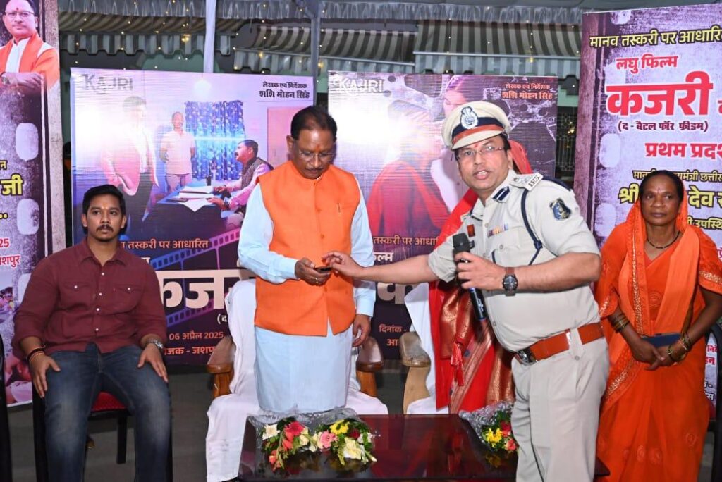 जशपुर।छत्तीसगढ़ के मुख्यमंत्री विष्णुदेव साय की गरिमामय उपस्थिति में दिनांक 06.04.2025 को ग्राम बगिया निवास कार्यालय में एसएसपी शशि मोहन सिंह द्वारा मानव तस्करी पर लिखित एवं निर्देशित लघु फिल्म ”कजरी“ द बैटल फाॅर फ्रीडम का भव्य प्रथम प्रदर्शन किया गया, इस दौरान उनकी धर्मपत्नी कौशल्या साय सहित भारी संख्या में अधिकारीगण, जनप्रतिनिधि एवं आम ग्रामीणजन उपस्थित थे।