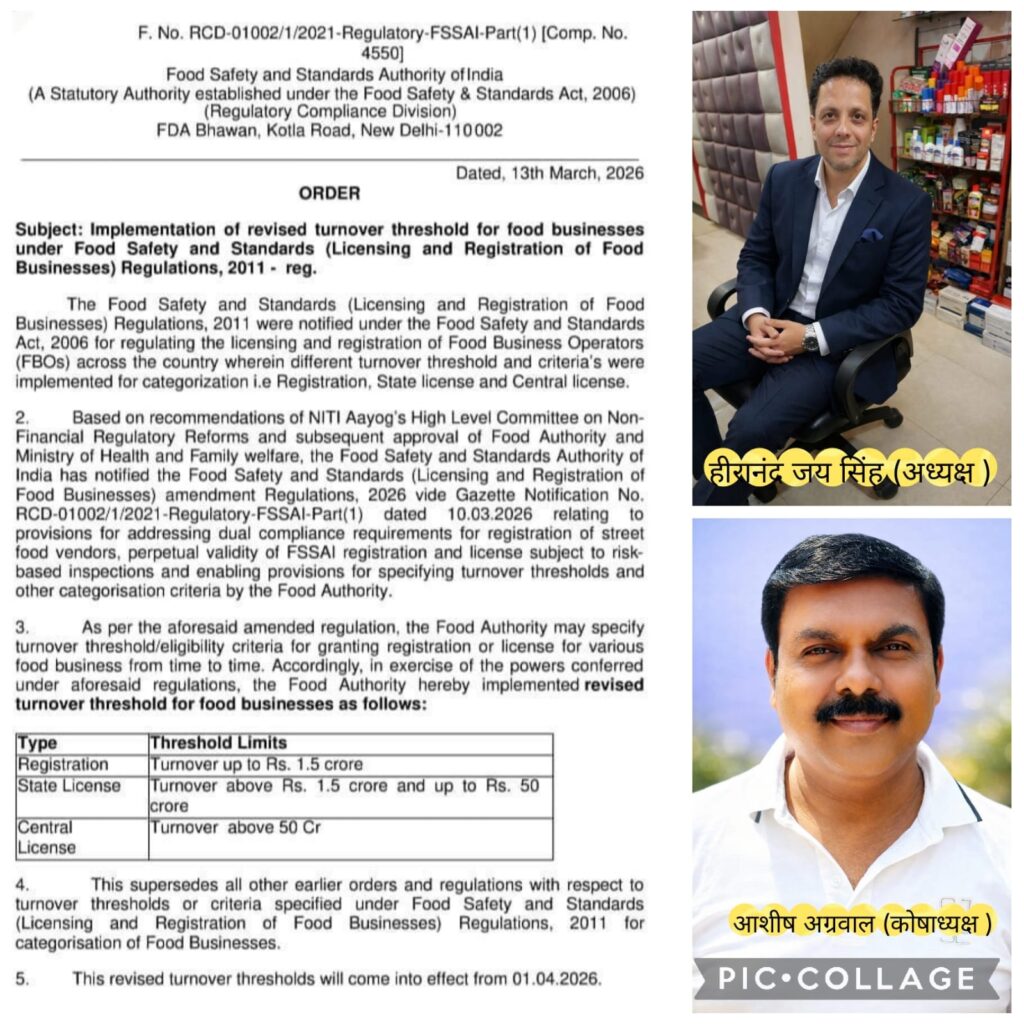 हीरानंद जयसिंह ने कहा कि नए प्रावधानों के अनुसार 1 अप्रैल 2026 से मूल पंजीकरण के लिए वार्षिक कारोबार की सीमा ₹12 लाख से बढ़ाकर ₹1.5 करोड़ कर दी गई है। इस निर्णय से देशभर के सूक्ष्म एवं लघु खाद्य व्यवसायों को अनुपालन के बोझ से बड़ी राहत मिलेगी तथा छोटे व्यापारियों के लिए व्यवसाय करना अधिक सरल होगा।