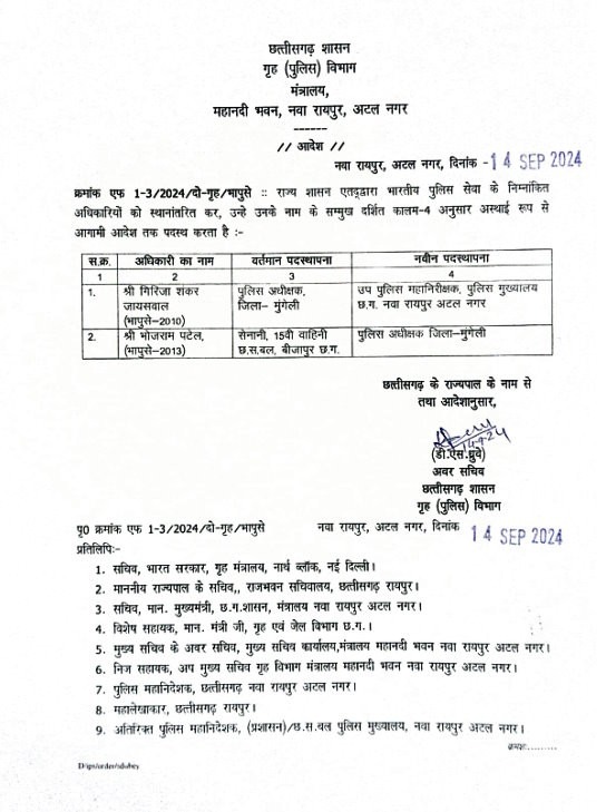 रायपुर / आख़िरकार सीएम ने कलेक्टर एसपी कांफ्रेंस में कमाल कर ही दिया….और DIG/SSP गिरिजा शंकर जायसवाल को PHQ अटैच कर दिया है….वही उनकी जगह पर बीजापुर बटालियन से आईपीएस भोजराम पटेल को मुंगेली जिले का कप्तान बनाया गया है….आपको बता दे की IPS भोजराम पटेल कोरबा,गरियाबंद जैसे जैसे जिले में पुलिस अधीक्षक की भूमिका निभा चुके है…वे मिलनसार और अच्छे IPS अफसरों में जाने जाते है…..